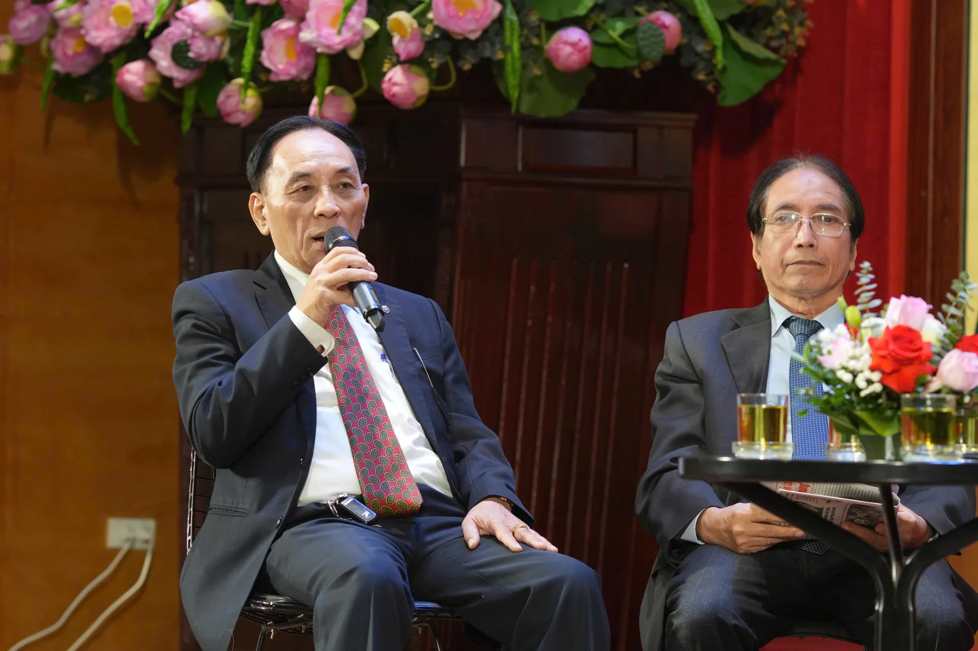 Ông Lê Trung Đức - Ủy viên Ban Thường vụ Hội Luật gia Hà Nội, Thành viên Ban Kinh tế - Ngân sách HĐND phường Tây Hồ (phát biểu bên trái) và GS.TS Nguyễn Minh Đoan (Trường Đại học Luật Hà Nội)