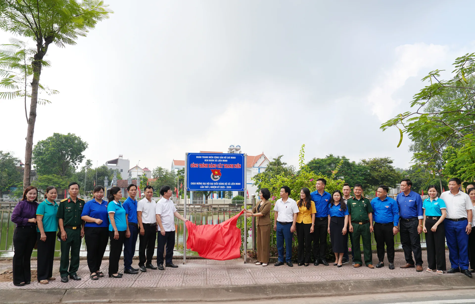 Bí thư Đảng ủy, Chủ tịch HĐND xã Liên Minh Nguyễn Tiến Toàn; Phó Bí thư Thường trực Đảng ủy xã Nguyễn Thị Hường cùng các đại biểu gắn biển công trình Hàng cây thanh niên của Đoàn Thanh niên xã.