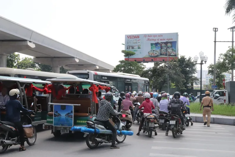 | Dòng người và phương tiện "chôn chân" dưới nắng tại ngã tư Hồ Tùng Mậu - Nguyễn Cơ Thạch. |