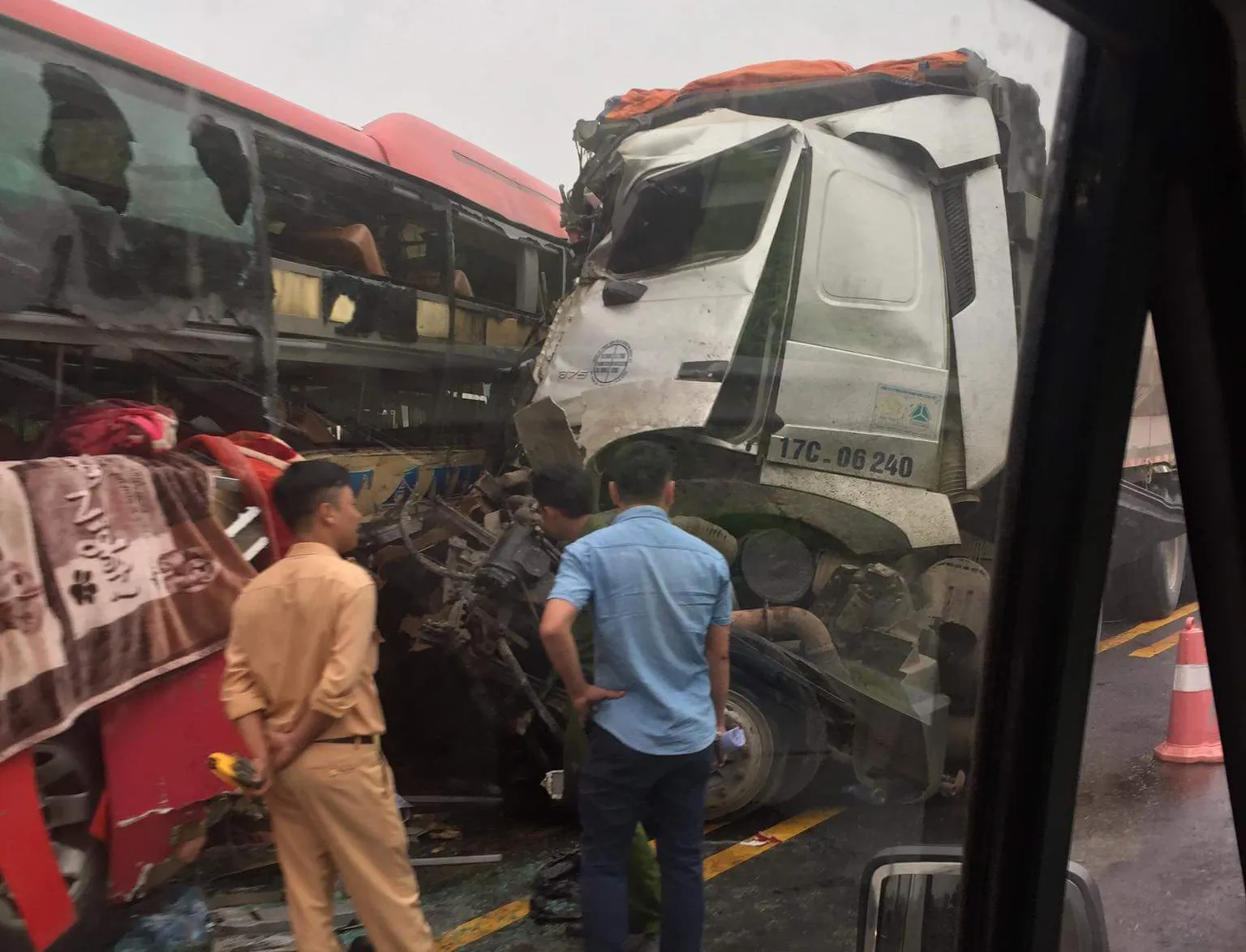 Tại hiện trường, ô tô tải và xe khách bị hư hỏng nặng phần đầu. Nhiều vật dụng và mảnh vỡ vương vãi trên đường.