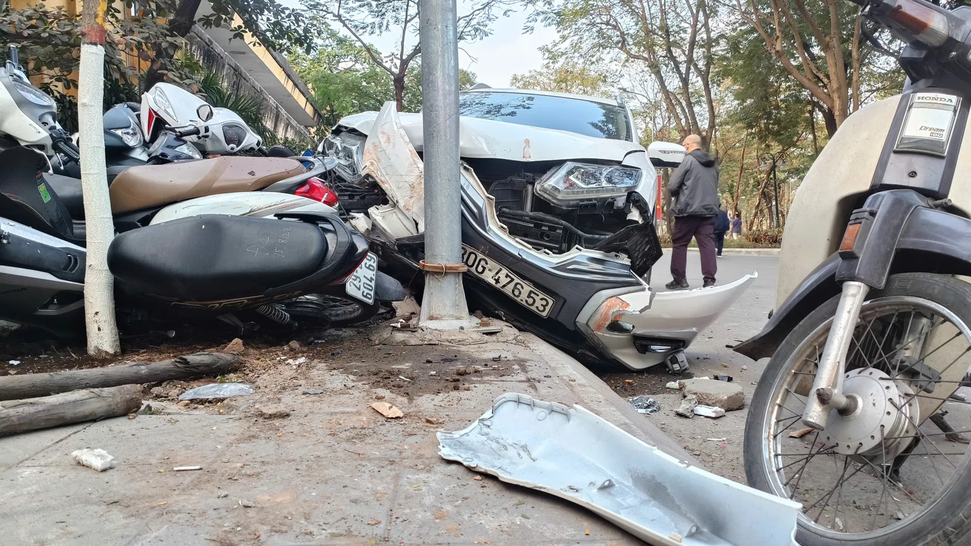 Chiều 1/1, xe ô tô con lưu thông theo hướng Võ Thị Sáu đi Thanh Nhàn (Hà Nội), đâm vào xe máy do 1 người đàn ông điều khiển và 6 xe máy dựng trên vỉa hè.