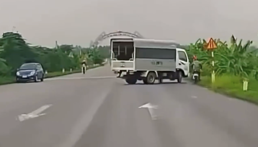 Mạng xã hội vừa xuất hiện đoạn clip dài 16 giây ghi lại hình ảnh một chiếc xe tải gắn biển tập lái bất ngờ quay đầu chiếm hết làn đường bên cạnh, khiến một tài xế xe máy bất ngờ phải đánh lái phi thẳng vào vệ đường để tránh xảy ra tai nạn.