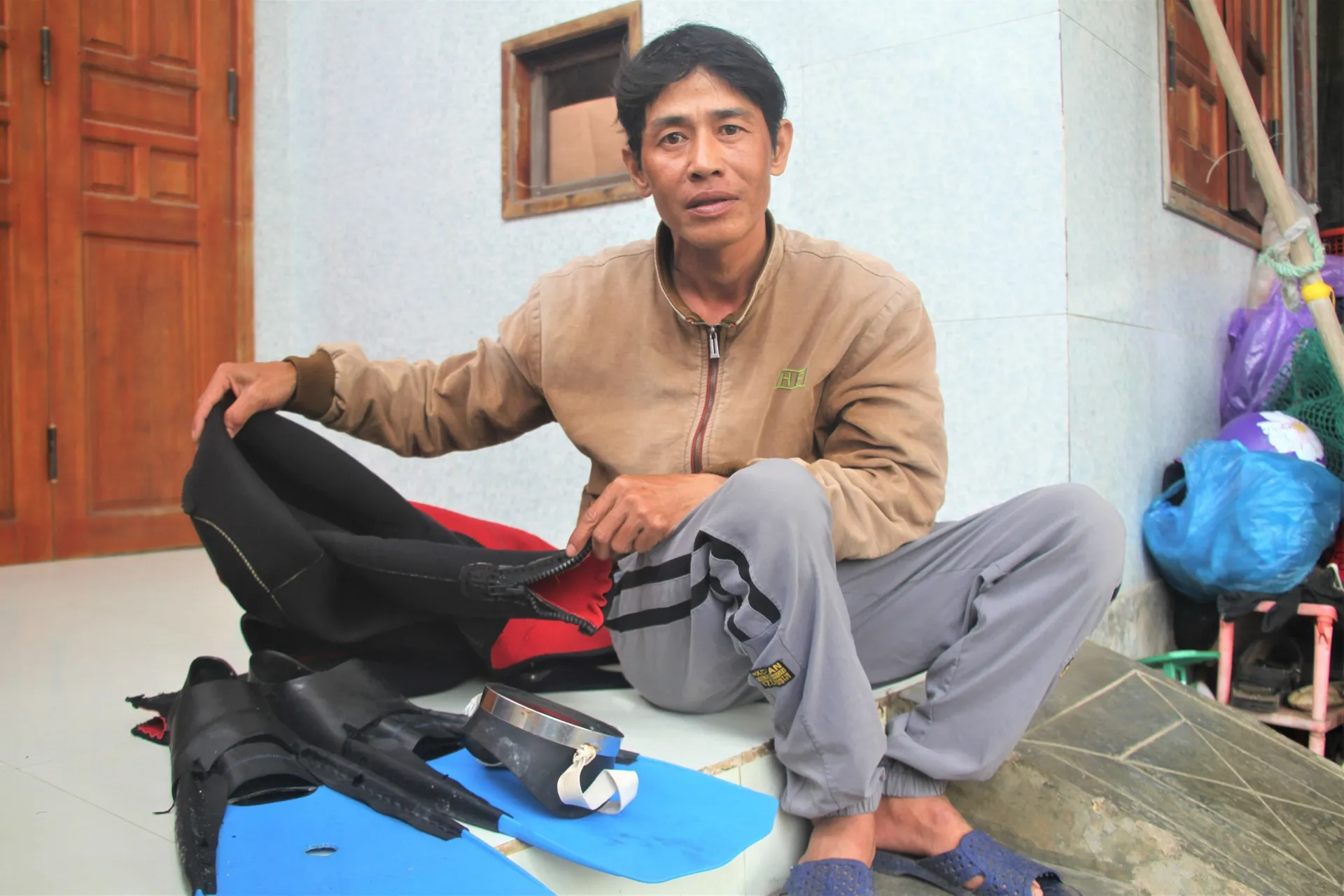 Ngư dân Trương Văn Tin cùng những vật dụng không thể thiếu của nghề lặn biển.