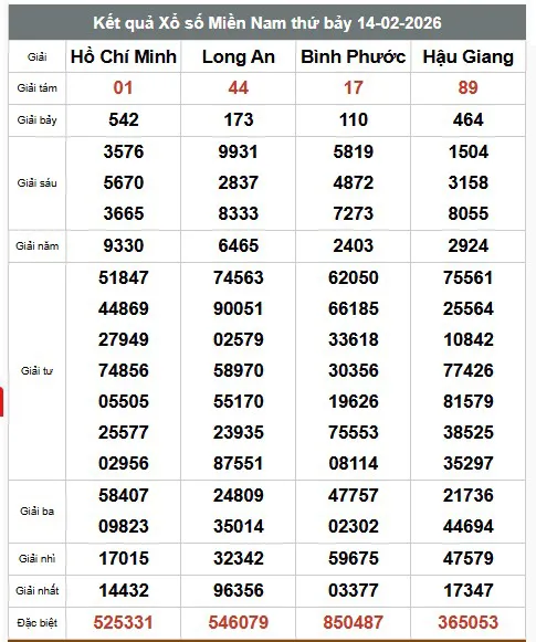 XSMN - Trực tiếp kết quả xổ số miền Nam hôm nay ngày 14 tháng 2 - KQXSMN 14/2/2026
