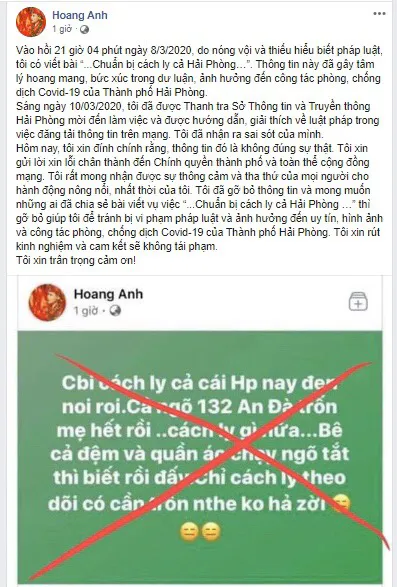 Trước đó vào 21h4 ngày 8/3/2020, một cá nhân đăng tải thông tin trên mạng xã hội facebook, tài khoản Hoang Anh (Cô đồng Hoàng Anh), với nội dung: Chuẩn bị cách ly cả Hải Phòng…, gây hoang mang trong dư luận, làm ảnh hưởng đến công tác phòng, chống dịch tại địa phương.