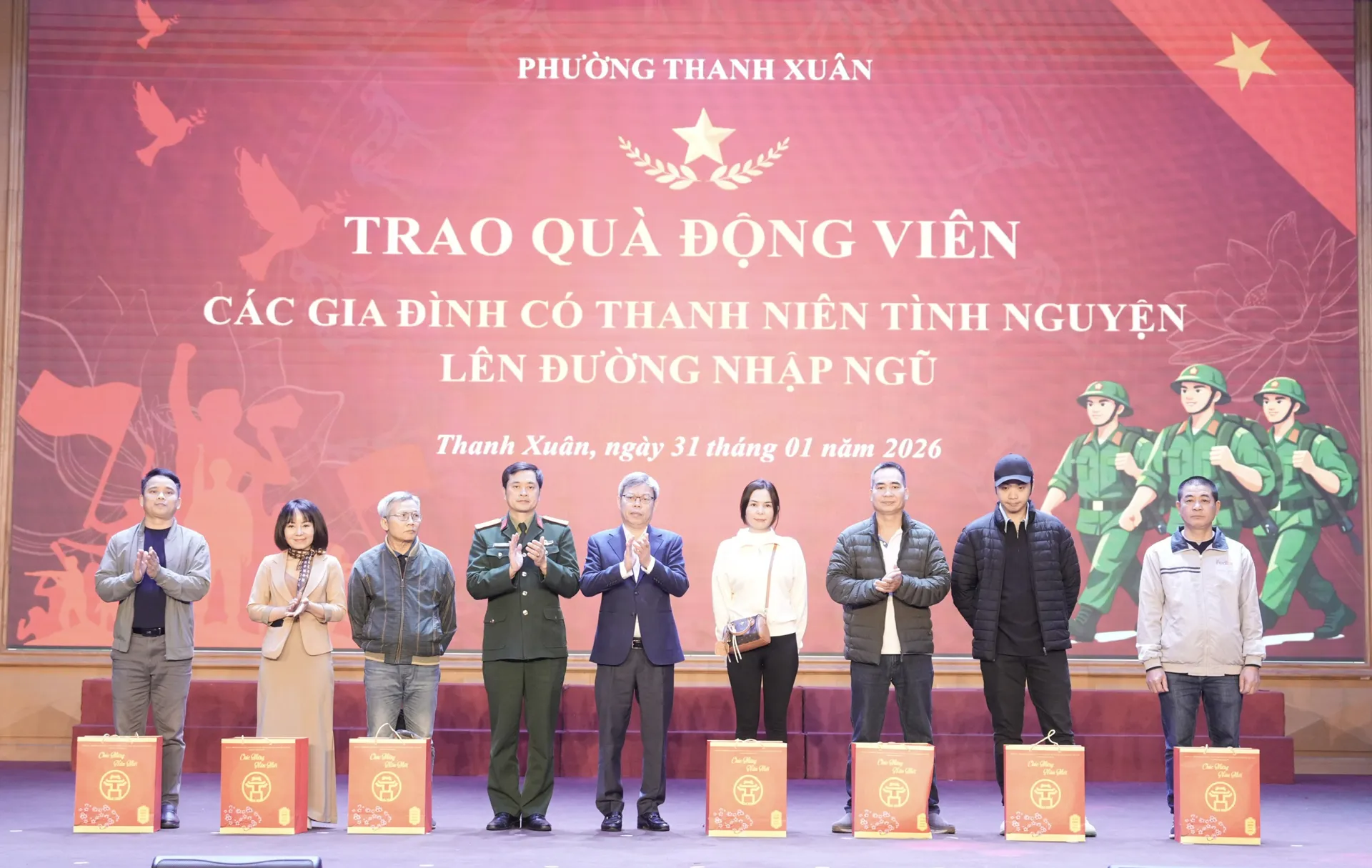 Lãnh đạo phường Thanh Xuân tặng quà cho các gia đình có thân nhân xung phong lên đường nhập ngũ